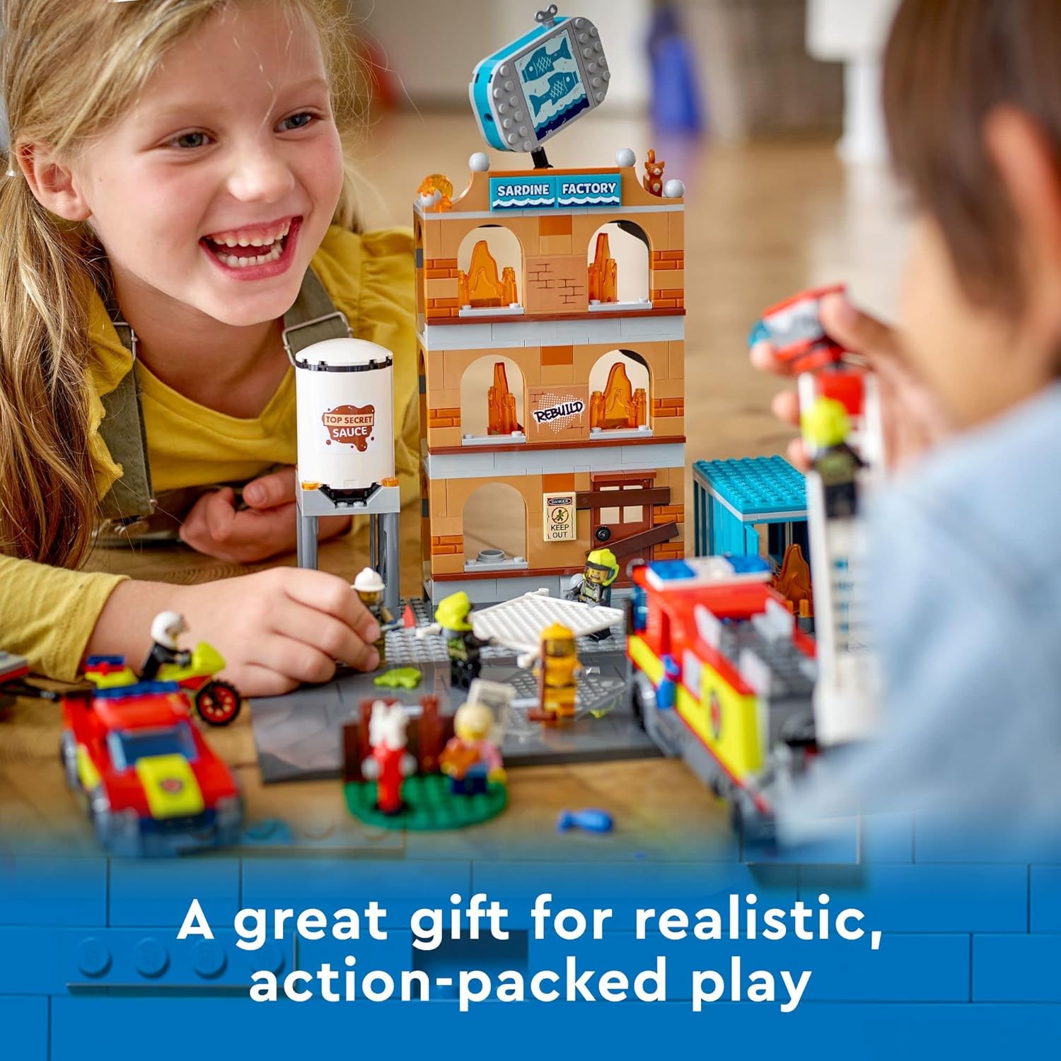LEGO City Fire Brigade set for kids 7 + years old features a 3-level sardine factory with fold-back LEGO flames, a ‘secret sauce’ vat, and more!