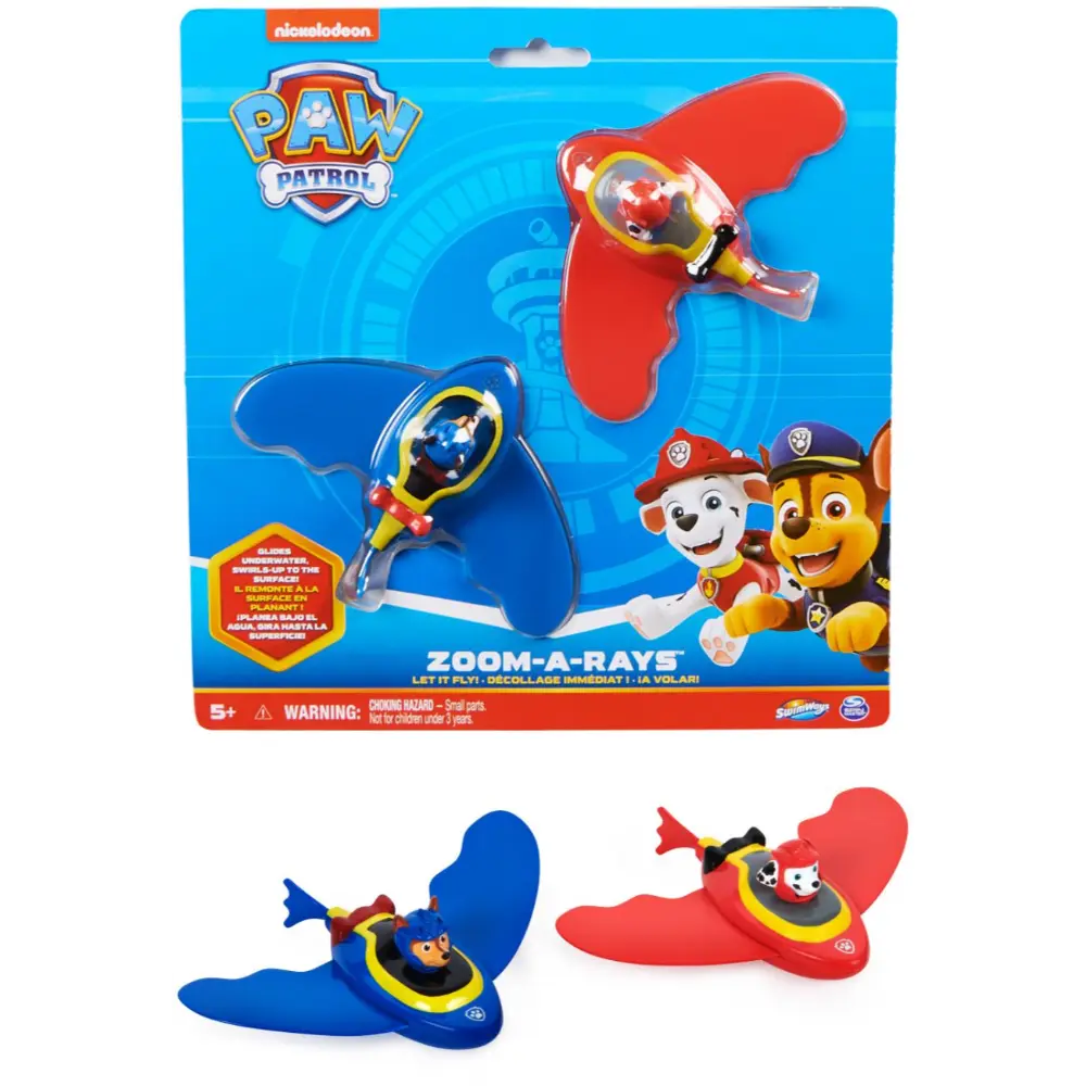 The Paw Patrol Zoom-A-Rays swimming pool toys from SwimWays is a kid-powered underwater glider with amazing hydrodynamic action! This Paw Patrol toy brings your favorite pups, Chase and Marshall, to the pool, lake or beach for a day of fun and water exploration! No batteries are required to play, simply submerge under water, and let them glide! Your little ones will love watching Chase and Marshall as they drift through the water and swirl to the surface, with the hydrodynamic action propelling the pups at high speeds!