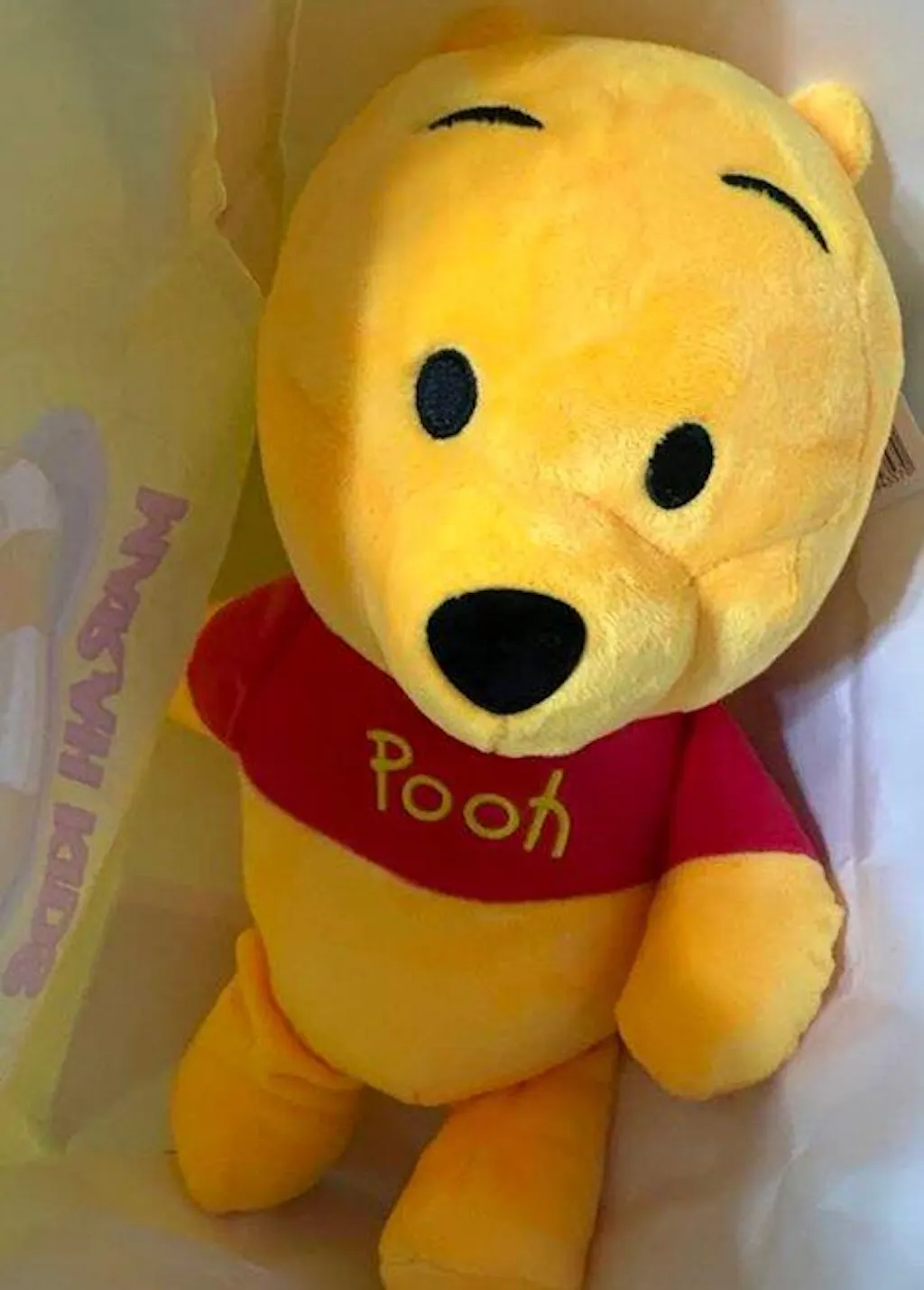 Magical childhood memory for people of all generations and for generations to come. The honey-loving hero of many Disney films wears a red embroidered cotton-linen with the name of "Pooh".