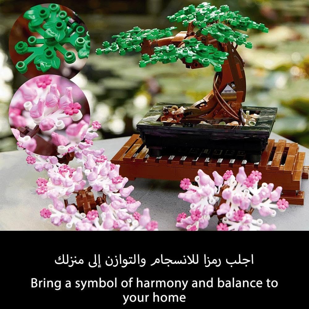 Features a bonsai tree model with a rectangular pot and a slatted wood-effect stand, made of LEGO elements, designed for adults