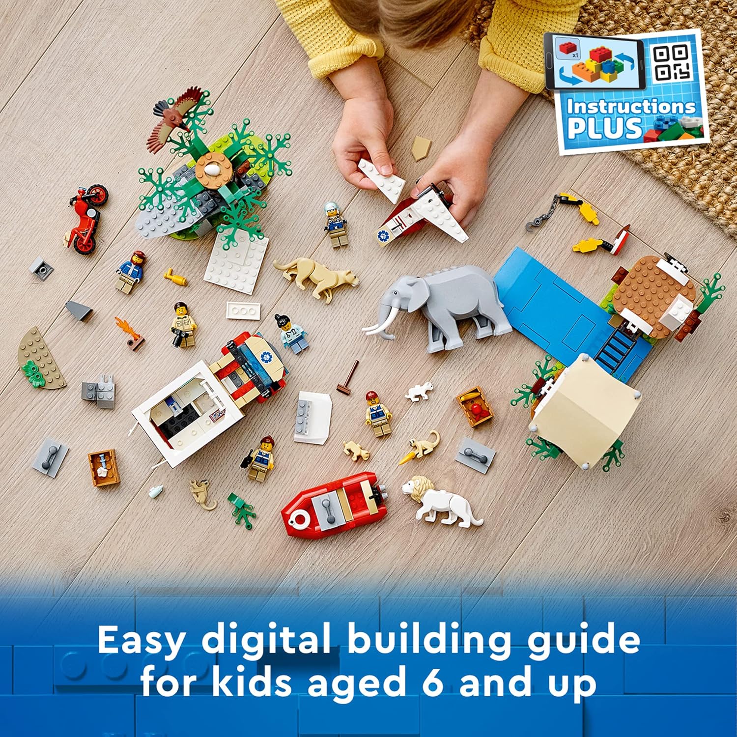 Includes a LEGO toy treehouse-camp, mobile research lab, motorbike, ultralight and a floating dinghy, plus 6 minifigures and eagle, elephant, lion, lioness, 2 cub, and 2 monkey figures